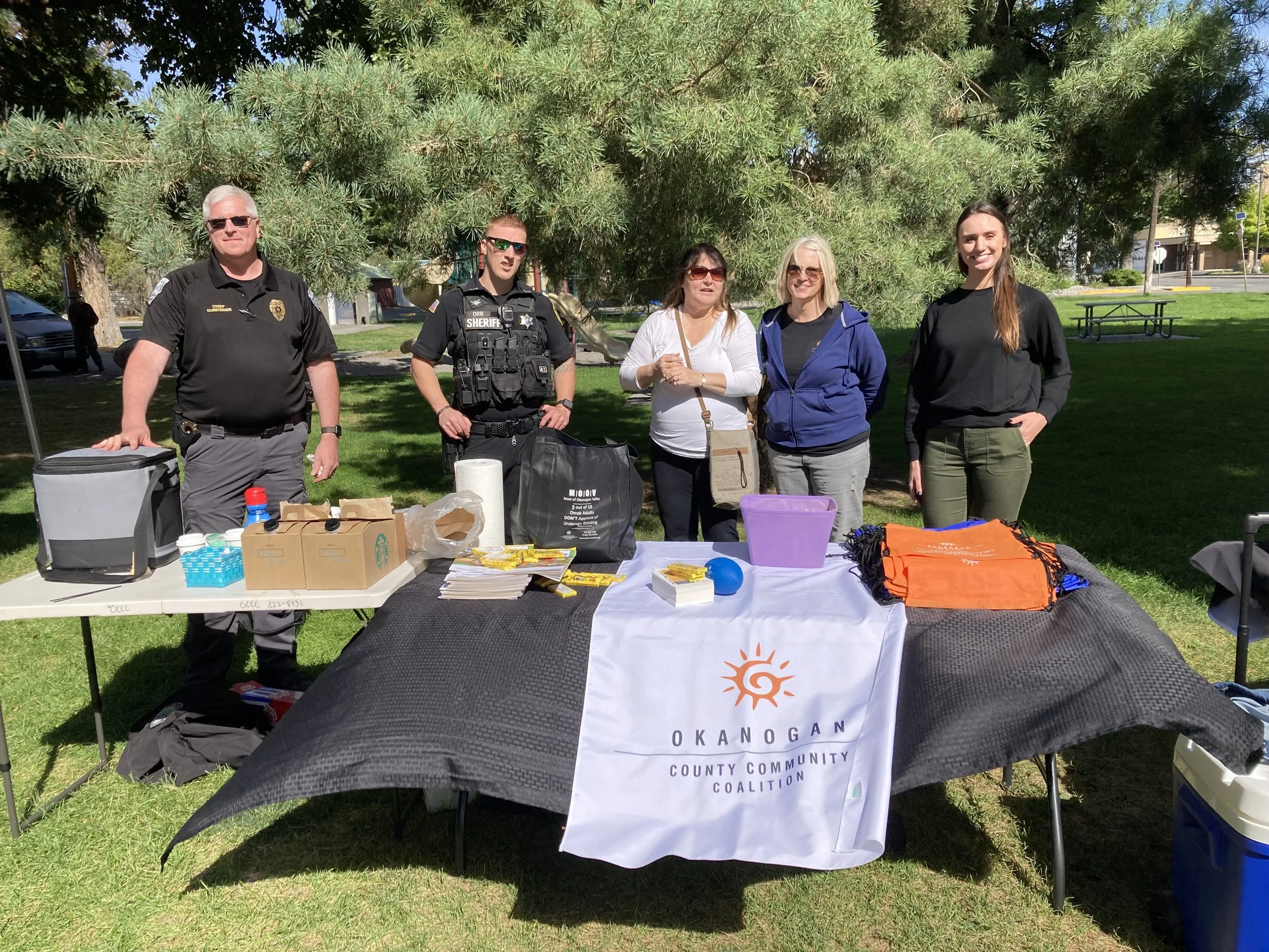 September 17, 2022: OPD’s Chief Christensen, OCSO’s Deputy Orr, Omak Mayor Cindy Gagne, OCCC’s Stacey Okland, and OCCC’s Georgia Lamb pose for a group photo at the Dads MOVE sponsored “Family Fun Day in the Park” event.